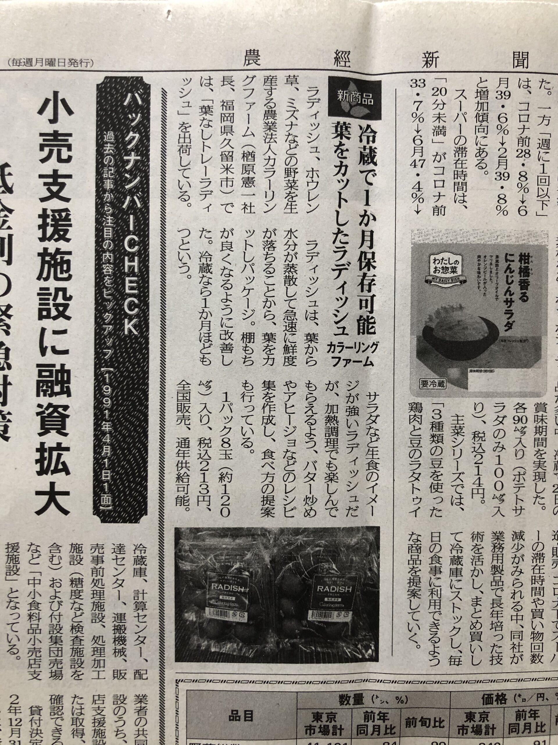 ラディッシュの新しい規格の商品について農経新聞さんに掲載してもらいました。農経新聞さんは青果流通に特化した専門紙です。どなたかの目にとまればいいなーと思っています。